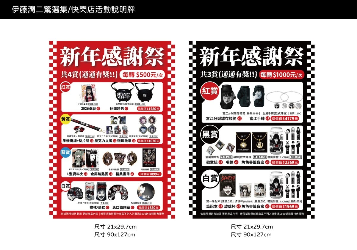 獨家打造的「轉珠抽獎」活動,分別有每轉$500元共四賞好禮,還有每轉$1,000元共三賞好獎兩種選擇,讓大家把富江分裂罐存錢筒、休閒跨包,以及金屬徽章等好禮通通帶回家!