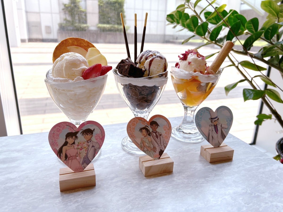 特別推出的三款角色主題冰淇淋聖代,包含新一&小蘭、平次&和葉,以及基德版本,分別對應草莓、巧克力與玫瑰香草風味。只要點購聖代,就能獲得愛心造型 LOVE 紀念卡,甜度直接爆表!