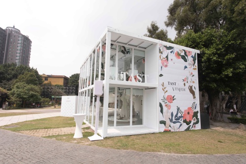 這次TAST在華山藝文中心打造一間二層樓的白色透明玻璃屋,遠遠看就非常顯眼,二樓的落地窗以花卉圖樣裝飾,呈現一個夢幻的空間!