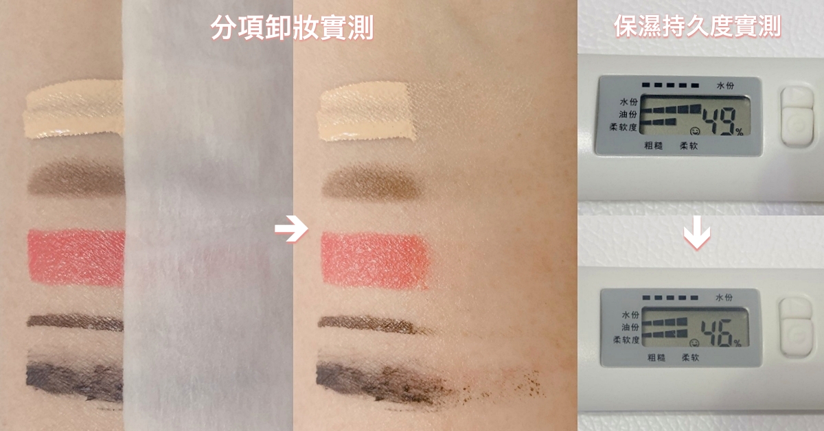 (卸完5分鐘後測量數值:保濕度46%、水份4、油份4、柔軟度5)