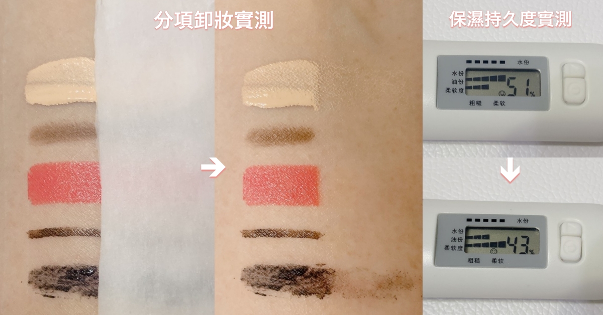 *備註:分項卸妝實測是以等量卸妝水充分浸透化妝棉,濕敷10秒後擦拭,重複以上動作2次後的卸除結果&殘妝量觀察。