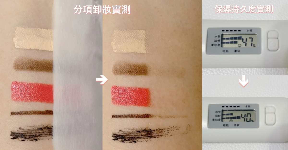 (卸完立即測量數值:保濕度47%、水份5、油份4、柔軟度5)