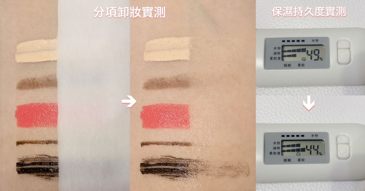 (卸完5分鐘後測量數值:保濕度44%、水份4、油份5、柔軟度4)
