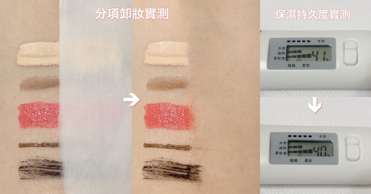 (卸完立即測量數值:保濕度41%、水份3、油份5、柔軟度3)
