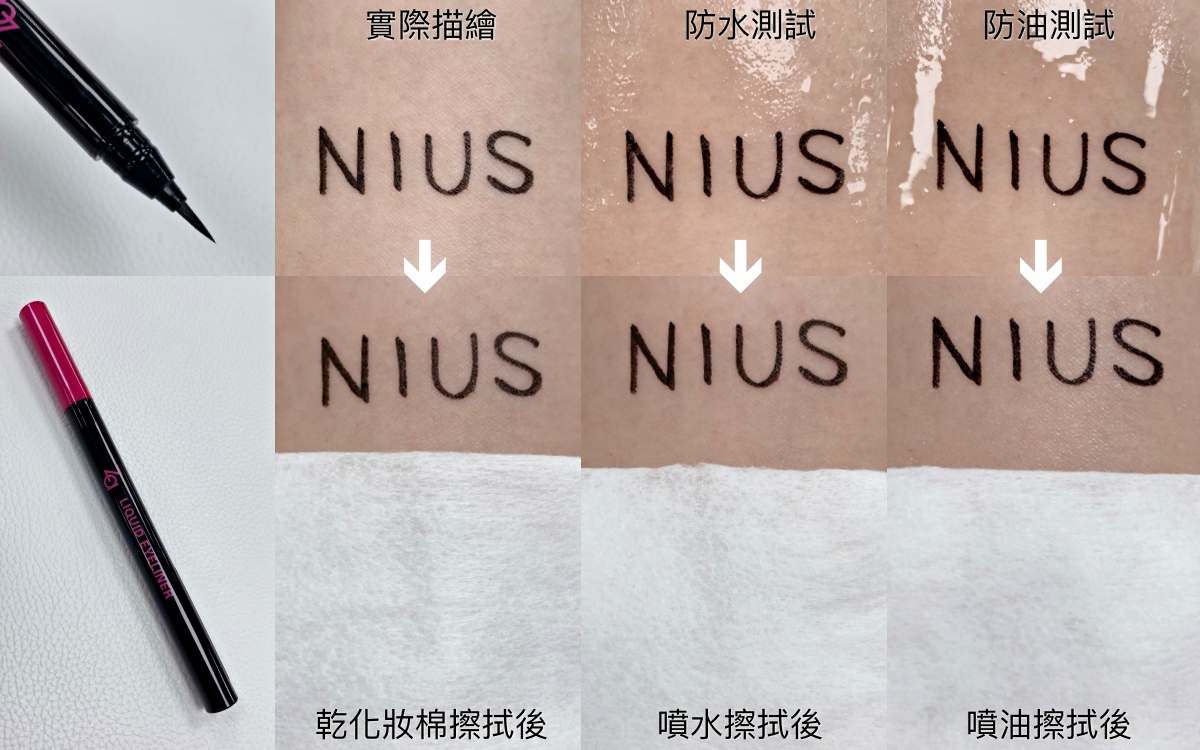 極細筆尖很好描繪細緻線條,一筆就很飽和顯色!實測乾擦的抗磨擦力很優,完全不脫色!噴水、噴油擦拭後也絲毫沒有脫妝暈染,線條與顏色依然非常漆黑清晰持妝。實測用卸妝棉卸妝約需擦拭10下即可卸除乾淨。
