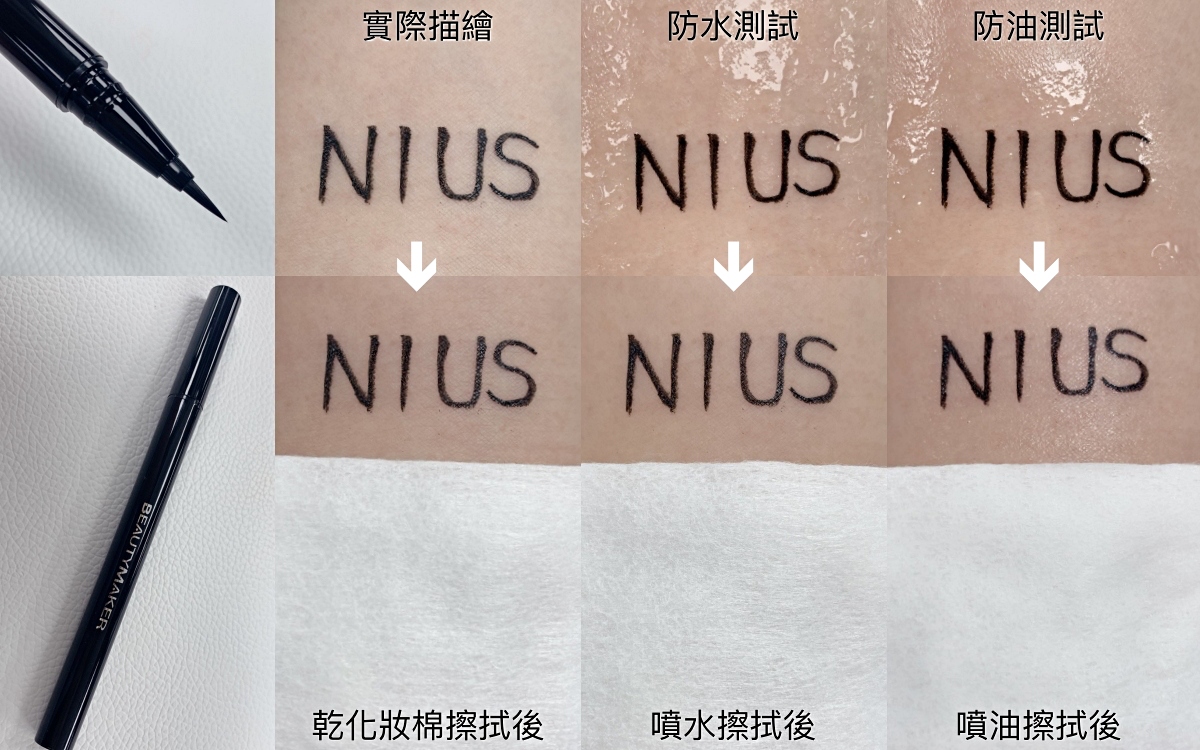 很適合眼睛容易流目油的人,實測防水防油持妝力非常優秀!畫內眼線也不容易暈,色澤飽和濃黑且附著力很好!完全不會暈染脫妝!實測用卸妝棉卸妝約需擦拭20下才能卸淨,不是太好卸的類型。