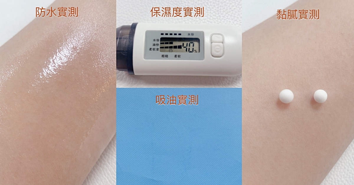 實測防水力雖較弱,沒有隔離水珠,但防曬乳沒有融化掉的跡象;實測保濕度還不錯,長時間也不會感覺乾燥!吸油&黏膩度實測結果也屬清爽!