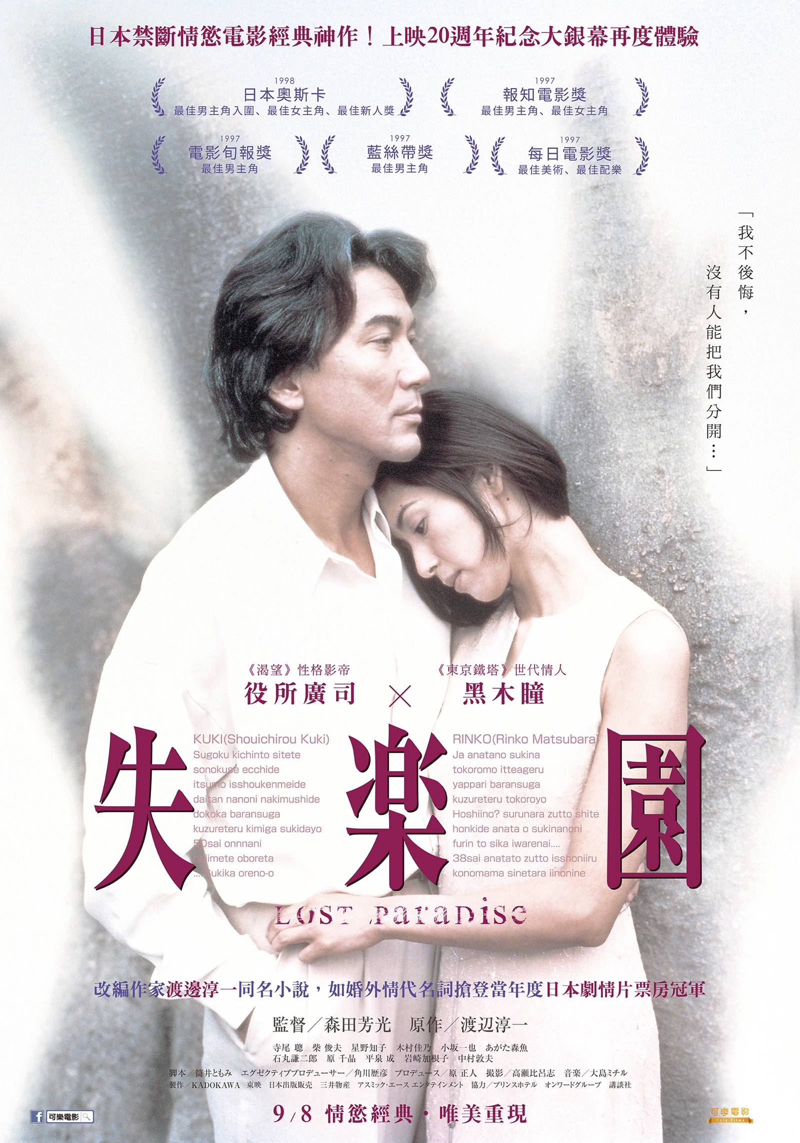 劇情簡介 1998日本電影金像獎入圍13項獎項,並榮獲最佳男主角提名及最佳女主角、最佳新人獎三項大獎。 改編自日本名作家渡邊淳一同名小說,《宛如阿修羅》《家族遊戲》日本大師名導森田芳光生涯代表作。役所廣司、黑木瞳主演。 久木祥一郎(役所廣司 飾)是一家出版社的資深總編,與陶藝家妻子相敬如賓,已成年的女兒(木村佳乃 飾)在醫院工作,很少回家。儘管擁有事業和物質上的成就,祥一郎對平靜無波的生活感到窒息。祥一郎有個情人,是業餘書法教師松原凜子(黑木瞳 飾)。凜子氣質高雅,聰慧美麗,是位有夫之婦,然而醫生丈夫對她的冷淡忽視,讓她的婚姻人前風光,人後淒涼。祥一郎與凜子在這樣的情形下相遇,兩人之間迸發激烈的愛情,以瘋狂炙熱的性愛救贖彼此。最後不倫之戀被揭發,祥一郎失去工作,並為了愛情與太太離婚,凜子則離開了丈夫,然而各方壓力依舊排山倒海而來,兩個人奔至被大雪覆蓋的別墅,在那裡一同服毒自殺。第二天,人們發現了他們倆緊緊結合在一起的屍體… 電影根據日本大師作家渡邊淳一同名小說改編,描述描述一對中年戀人的生死愛戀故事,細膩刻劃男女間不倫且炙熱的情感糾葛和性愛場景,在當年掀起日本海內外極大討論和觀影風潮。森田芳光以傑出的攝影與大膽性愛場面,描繪了這對遊走於慾望與道德掙扎間的情侶,獲得影評一致讚賞。電影不僅成為導演森田芳光的代表作,男女主角役所廣司和黑木瞳也因此片奠定兩人影壇地位,在當年度橫掃各大日本電影獎項,黑木瞳片中的風韻展現和激情演出,更讓她成為當年度男性心中的夢中情人。
