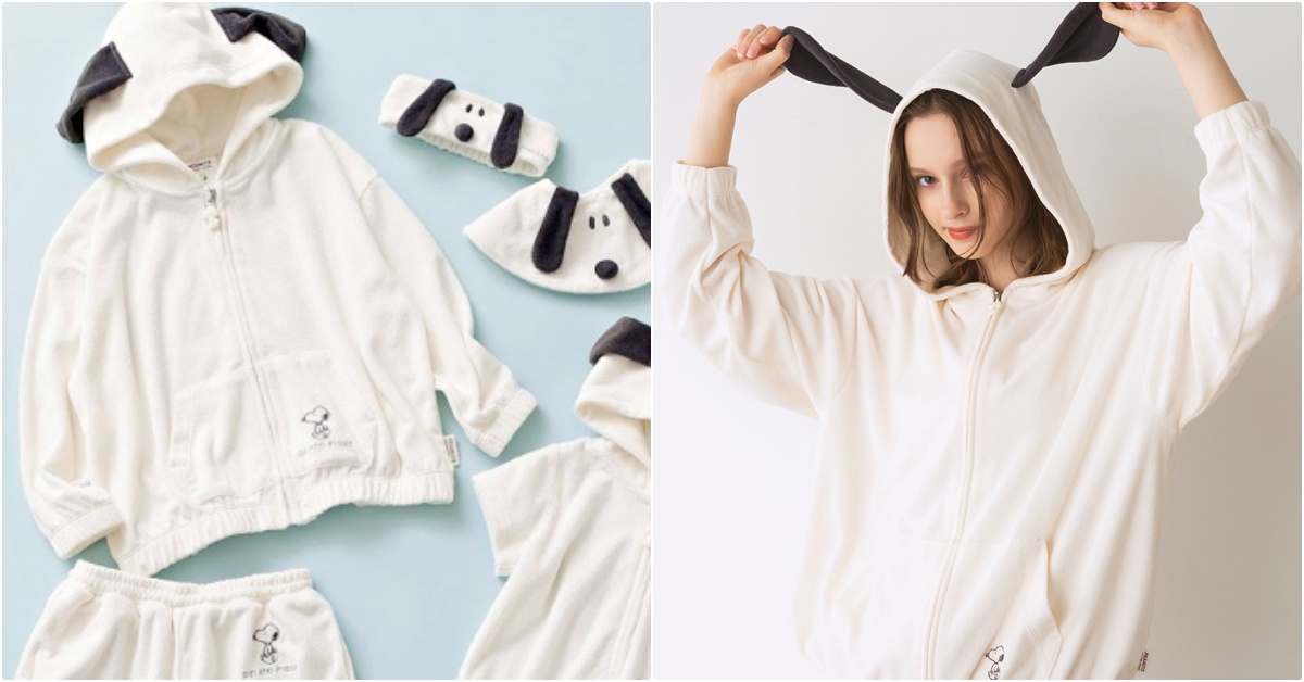 連帽外套+短褲的SET搭配奶油米的舒服主色系,在正面可以找到「小小的悠閒史努比一隻」,拉鍊拉環也做成小獵犬的模樣,這還不是最犯規的,在帽子上居然直接「神還原史努比的立體耳朵」,同樣有男女款、嬰兒款式,全家都都一秒變身成卡通界大明星。
